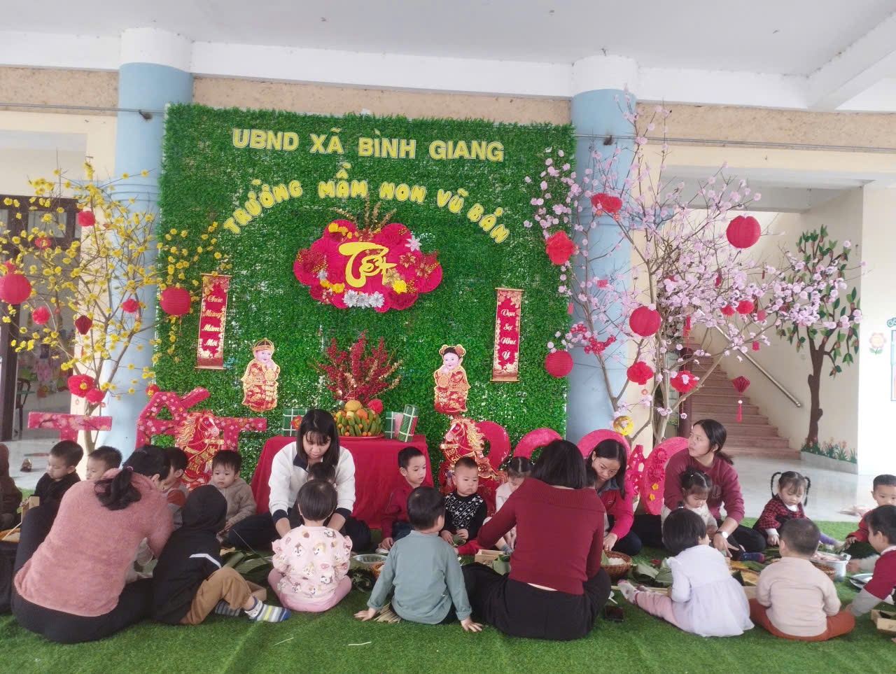 [ảnh] Trẻ được trải nghiệm gói bánh chưng Tết 2026 (Mầm non Vũ Bản)